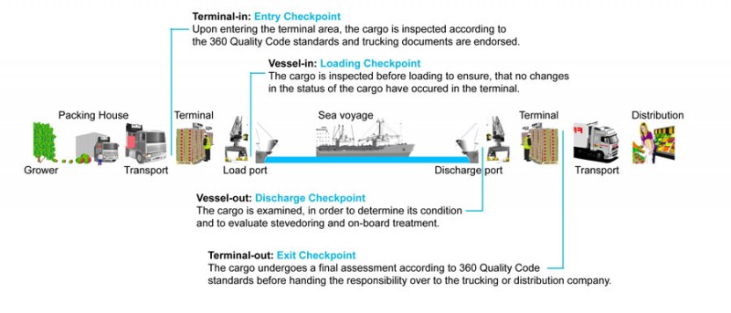 Necessary feedback is also provided to shippers and other participants of the supply chain thus expanding the coverage of the 360 Quality Code to the packinghouses. Since all cargo being loaded into a truck for carriage to a distribution facility on the consumer side is checked, a receiver of cargo can easily find out the source of damage if it occurred between the terminal and the arrival at the distribution centre.